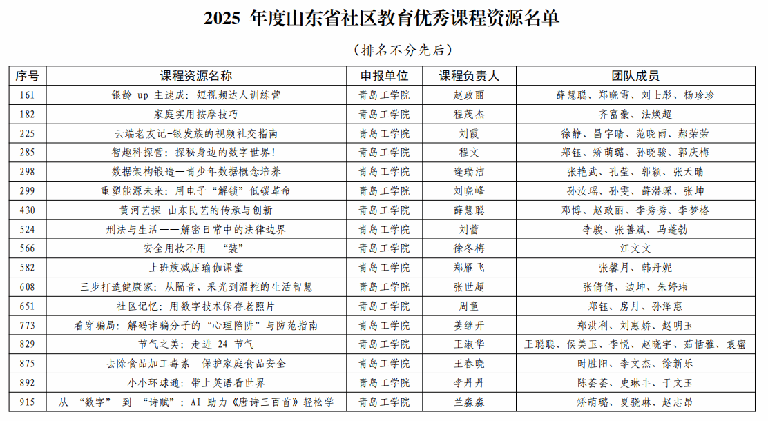 今年7月,山东省教育厅启动本年度社区教育优秀课程资源遴选工作,旨在推动优质教育资源向社区开放,服务全民终身学习。经单位推荐、专家评审等多个环节,全省共评选出优秀课程资源941项。我校本次申报的课程覆盖家庭教育、健康护理、职业技能、文化艺术、智能科技等多个领域,内容贴近居民生活,注重实用性与时代性,充分体现学校学科优势与社会服务功能的深度融合。