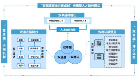 成果中的“双循环”指校内外实践平台协同联动,校内循环筑基、校外循环赋能,本质是打破校内外资源壁垒,形成“校内打基础、校外练实战”的互补生态;“双递进”指资源与能力协同递进,资源递进是教学维度、能力递进是学生维度,本质是通过资源与能力的双线协同递进,实现学生从“知识输入”到“复杂问题解决”的螺旋式成长;“双卓越”指培养卓越应用型人才和卓越创新人才。